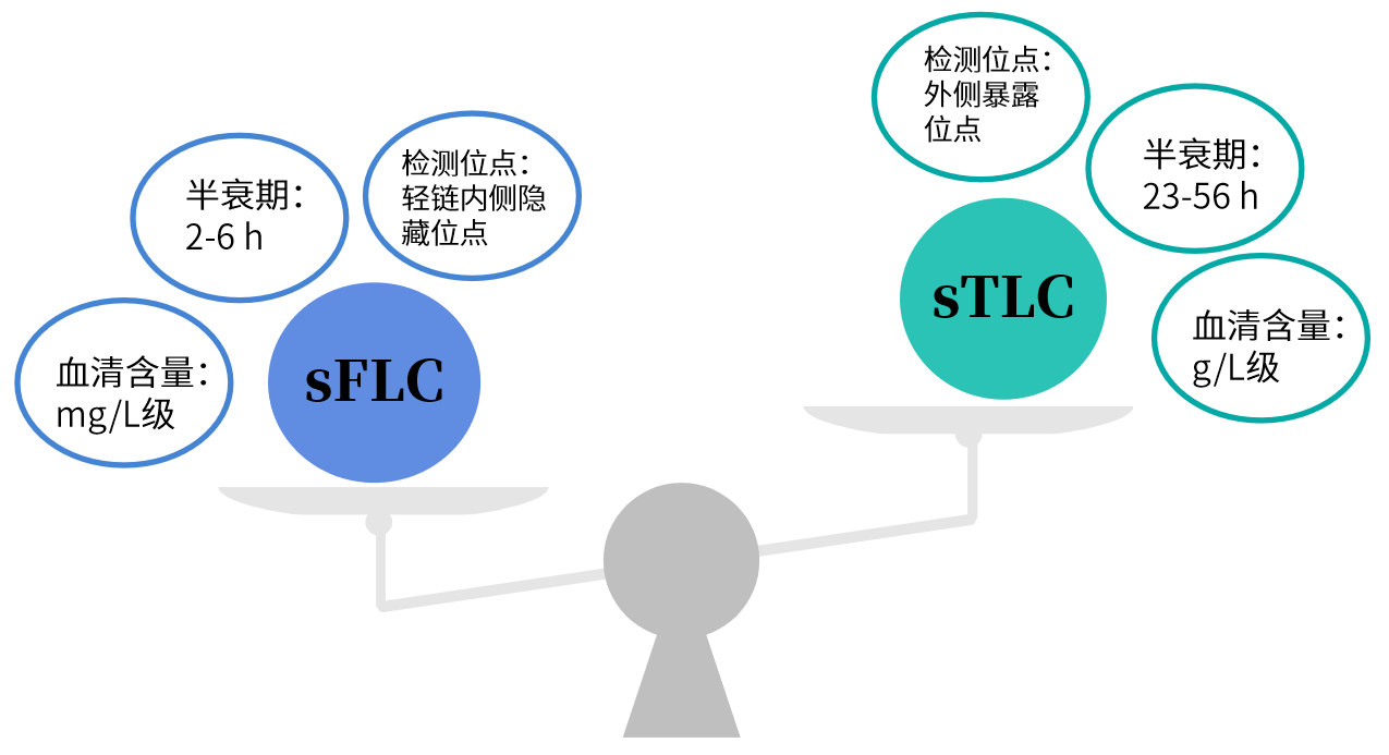 對(duì)于血清總輕鏈(sTLC),人體中血清游離輕鏈(sFLC)含量更少,能更靈敏反映濃度的異常,但其濃度升高的量值不一定能影響sTLC的量,所以sTLC可能依舊在參考范圍內(nèi)。