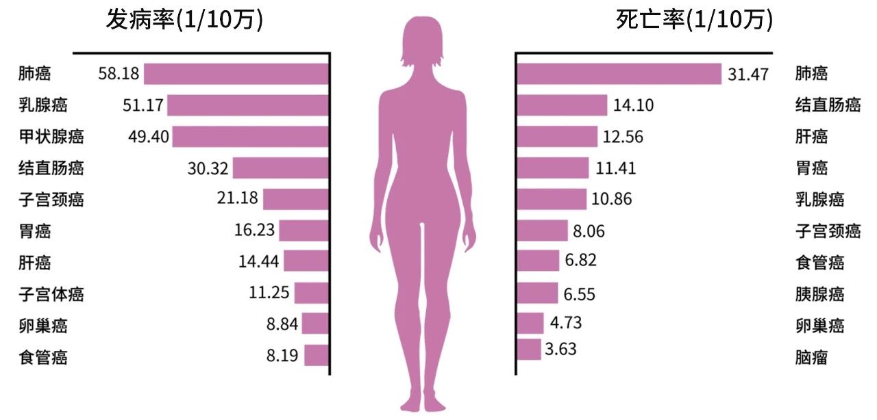 國家癌癥中心基于腫瘤登記及隨訪監測**數據,在JNCC上發布了2024年全國癌癥報告《2022年中國癌癥發病率和死亡率》。數據顯示:2022年,我國癌癥新發病例約482.47萬人,其中女性229.08萬例,占新發病例數的47.5%;我國癌癥死亡病例約257.42萬人,其中女性94.49萬例,占死亡總數的36.5%。盡管在發病率和死亡率上男性略高于女性,但是在年齡分布上,男性在25-54歲的發病率低于女性,女性患癌年齡趨于年輕化。所以,有必要提前了解,遠離高發癌癥!