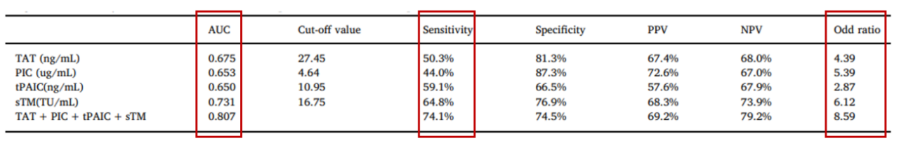 一項多中心前瞻性觀察研究表明TAT、PIC、tPAIC和sTM在不同基礎疾病的DIC患者中表現出良好的診斷性能和預后價值,TAT、tPAIC和sTM在pre-DIC的診斷具有一定的意義。此外,新血栓四項聯合檢測可增加AUC、靈敏度和優勢比,具有更高的檢測效能,有助于及時干預。
